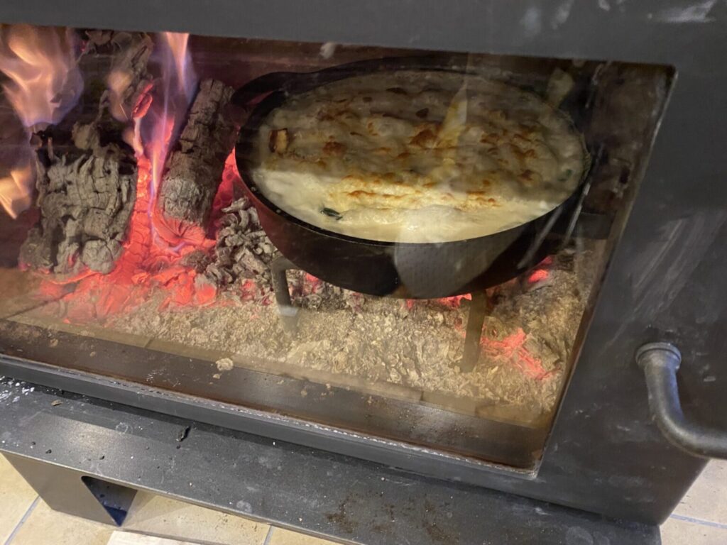 薪ストーブの上でじっくり温めるのにも活躍しています。