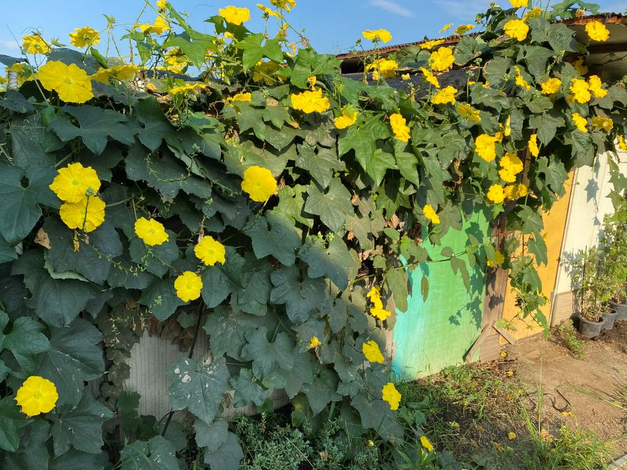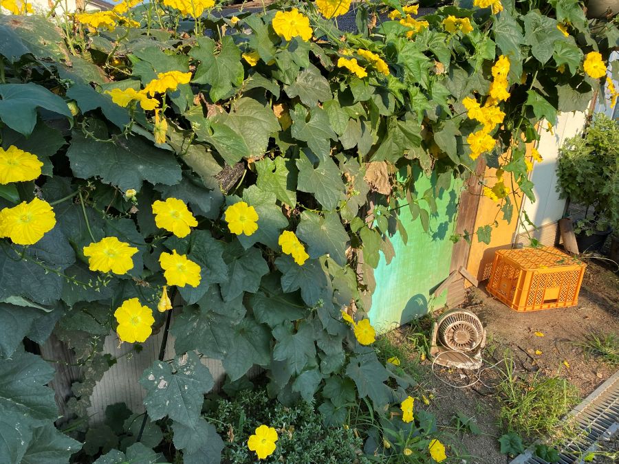 朝方は、へちまの黄色い花がたくさん咲いています。