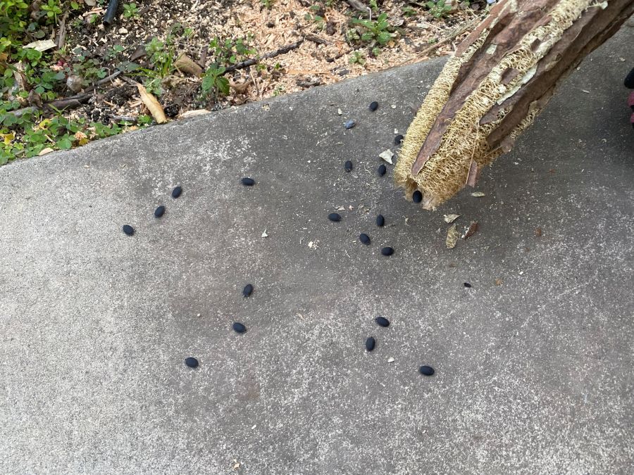 さっそく、穴が開いている方を下にして振ってみると、中からは黒いスイカのような種が出てきました。