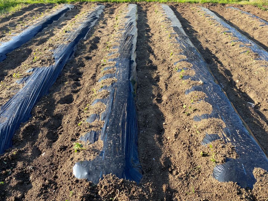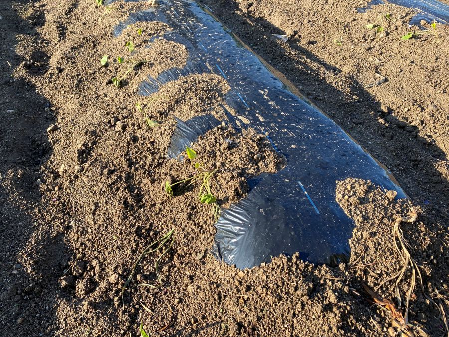 あらかじめ黒マルチを張って、そこに穴を開けて1本ずつ苗を植えていきます。