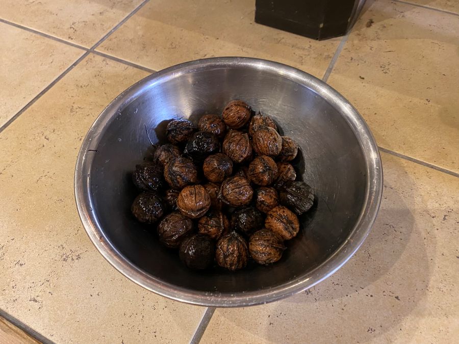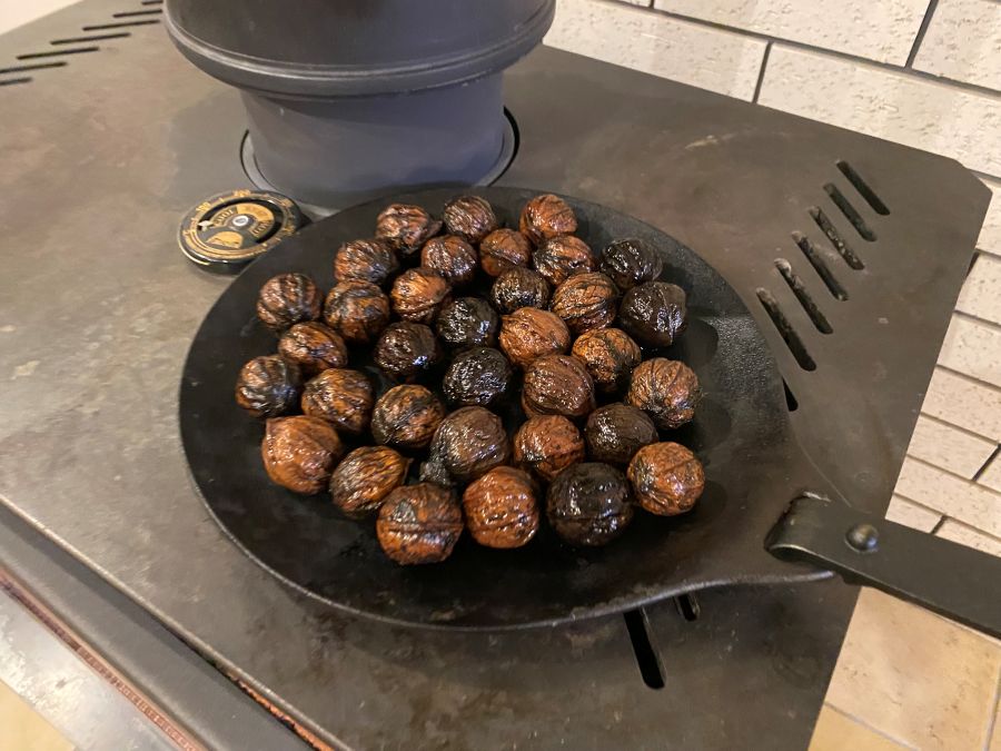 ということで、ピアットにクルミを入れて、薪ストーブの上で放置します。