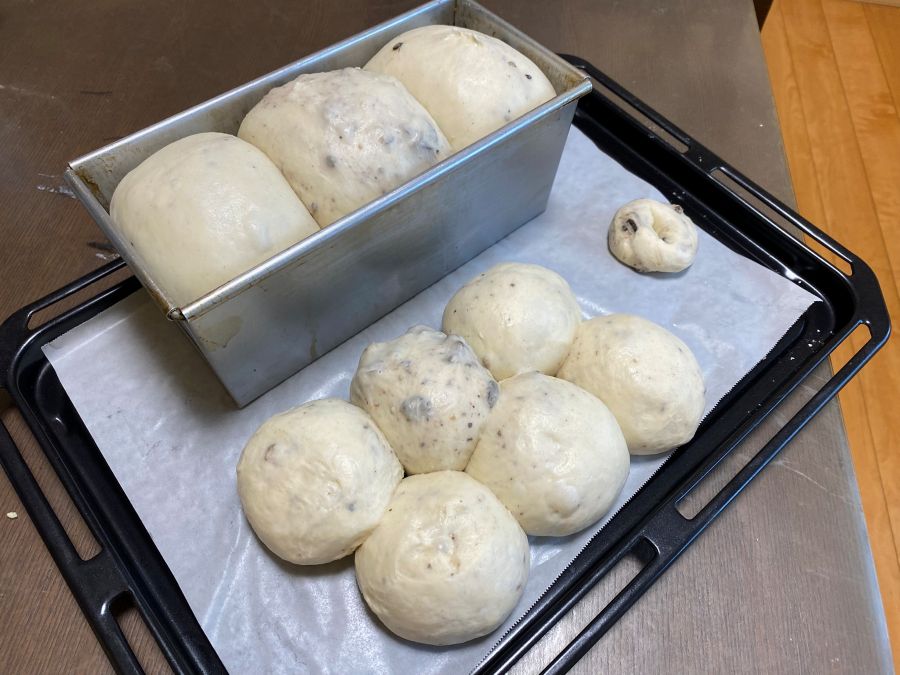 ざっくりと大き目に3つ丸めたものはパン焼きの型にいれるためのもので、残りは丸い普通のパンにしてみます。