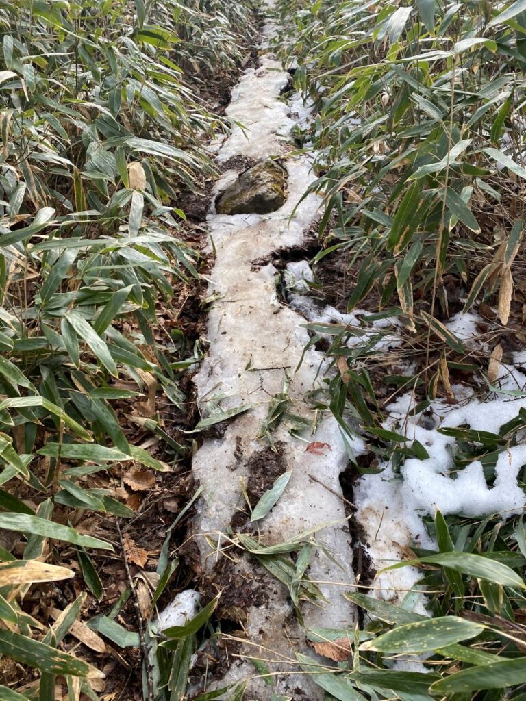 笹薮の中を通過するルートは、日陰のためか雪も残り、さらには霜柱のように盛り上がった地面にかなり苦戦しました。