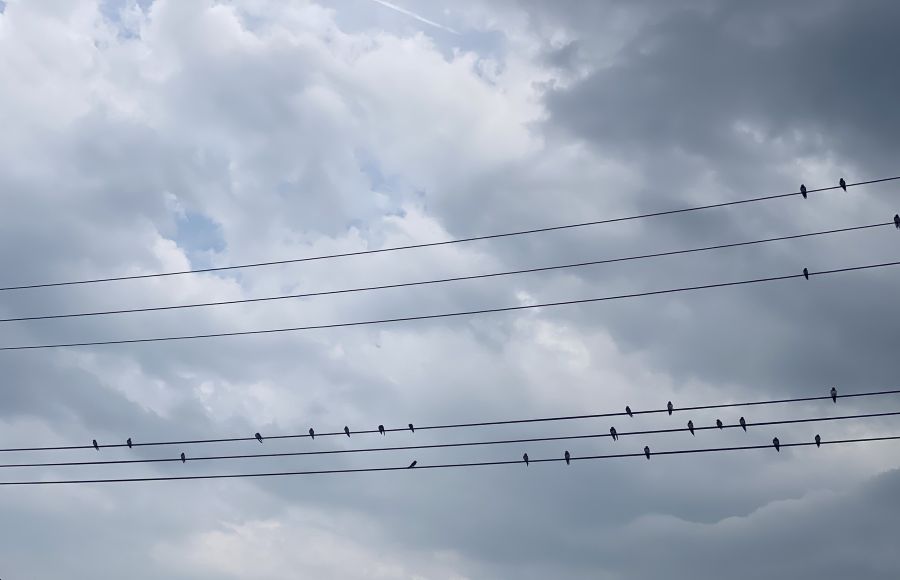 電線で並んで休むツバメたち。