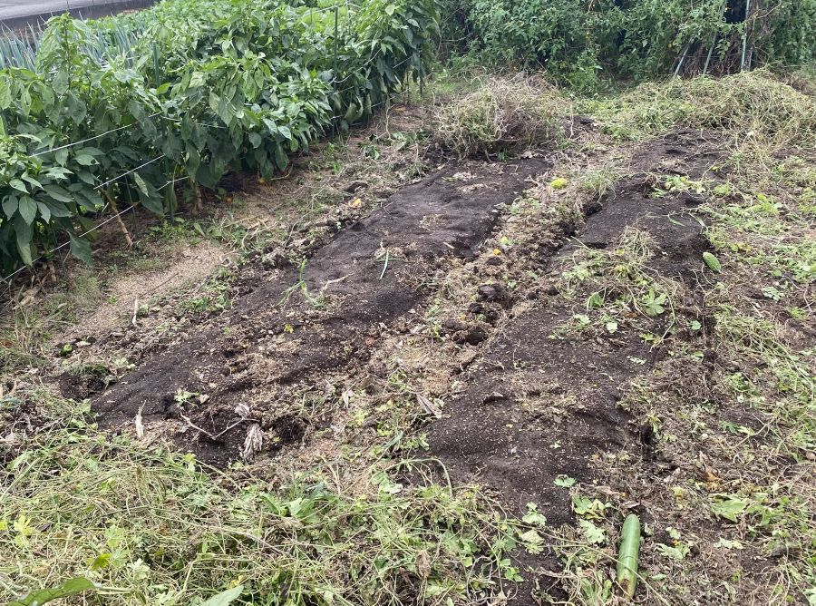 2列ありますが、向かって左側はキュウリ、右側がゴーヤを育てたところです。