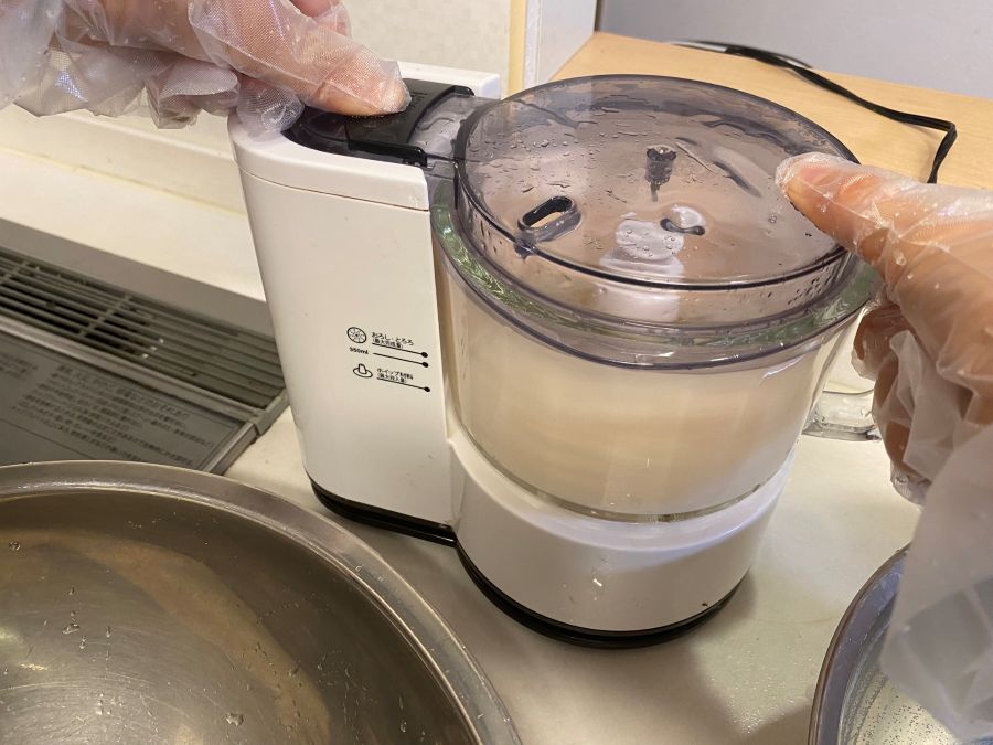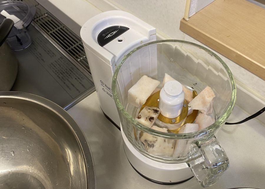 コンニャク芋をすりおろす工程ですが、大根おろしですりおろすのは時間がかかるため、ミキサーを使用します。