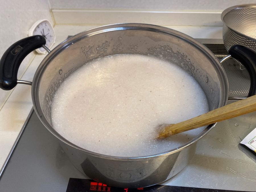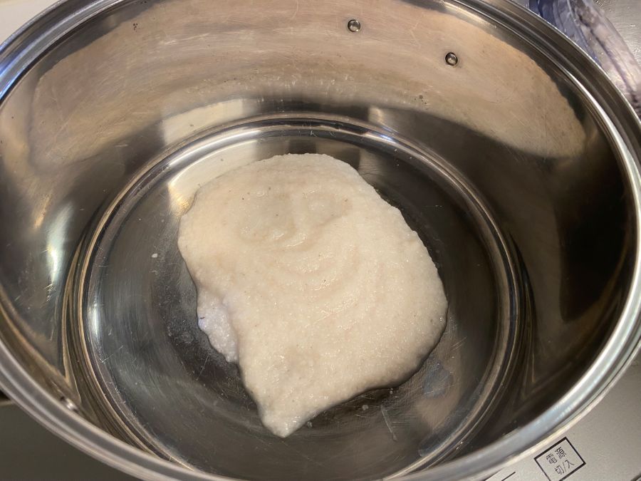 鍋いっぱいにすりおろしたコンニャク芋。