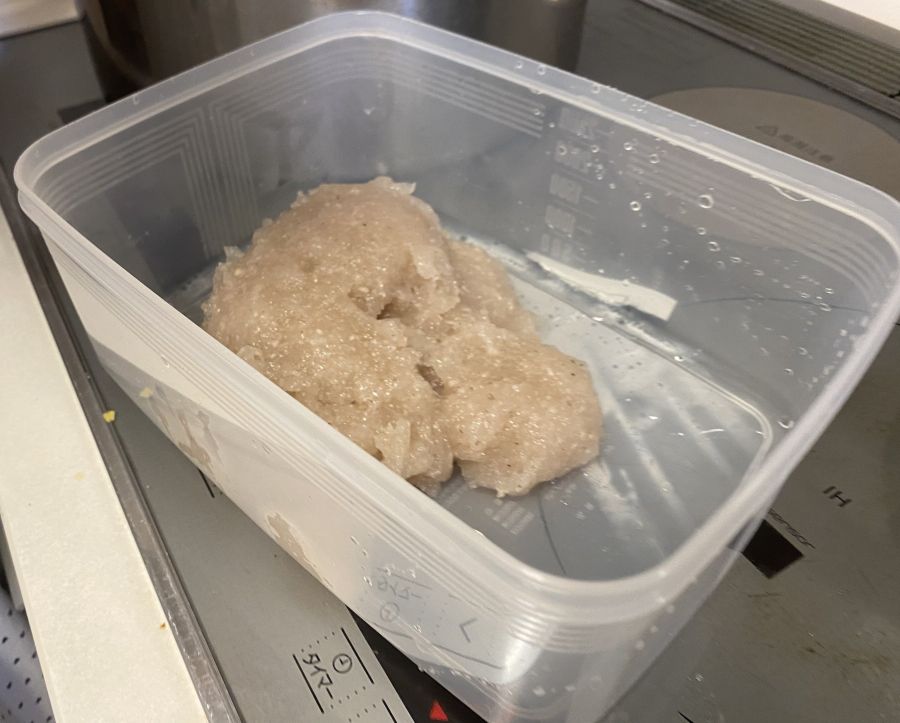 固まりかけのコンニャクを用意しておいたタッパーへと入れていきます。