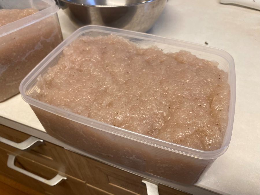 大鍋いっぱいに作ったコンニャクですので、大き目のタッパー2つ分になりました。