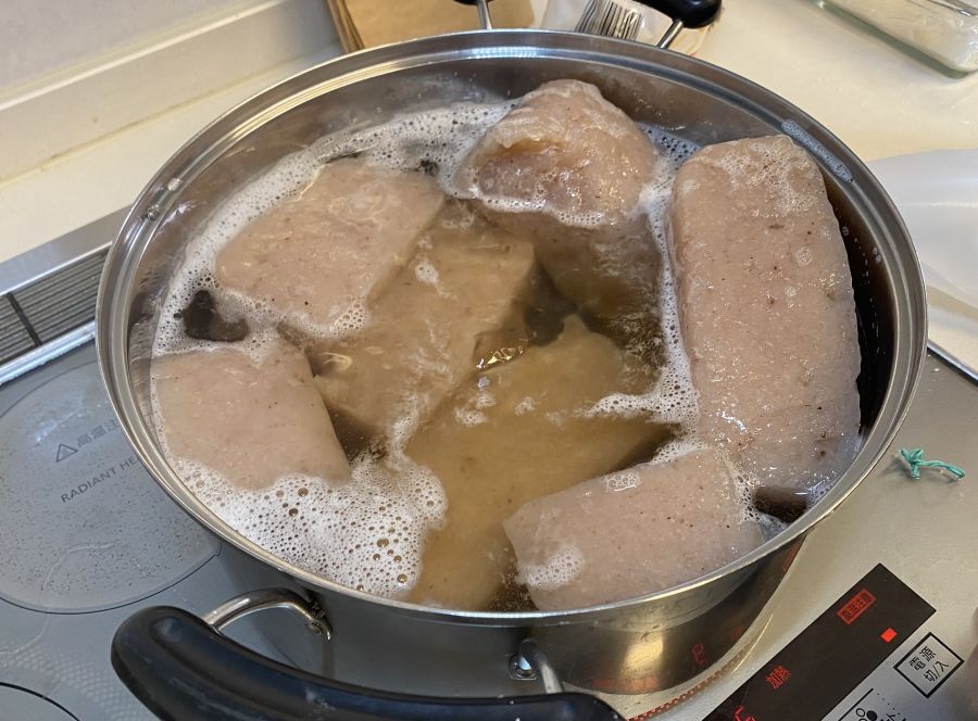 最後に適当な大きさに切って、鍋に煮てあくをとります。