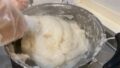 すりおろして鍋で火にかけて煮詰めたコンニャク芋に、「こんにゃくの素」をぬるま湯に溶かしておいたものを入れました。