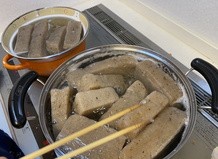 こちらのコンニャクは、そのままではあくがあることから、切り分けて鍋で茹でてあくを抜きます。