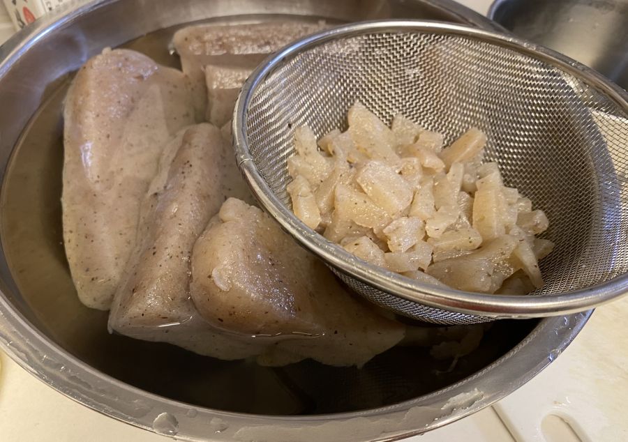 ということで、茹でてあく抜きを終えたコンニャクがこちら。