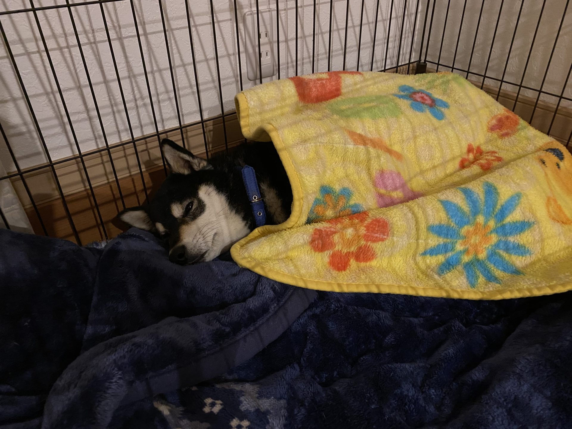 お気に入りの毛布をかけてあげると嫌がりもせず気持ちよさそうに眠ります。
