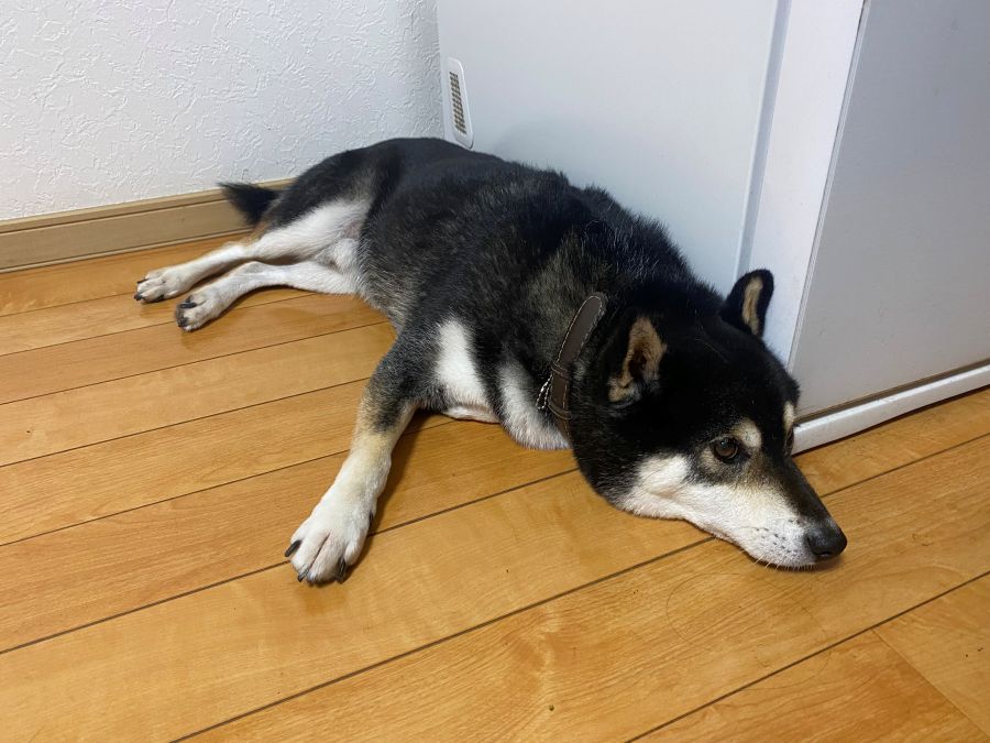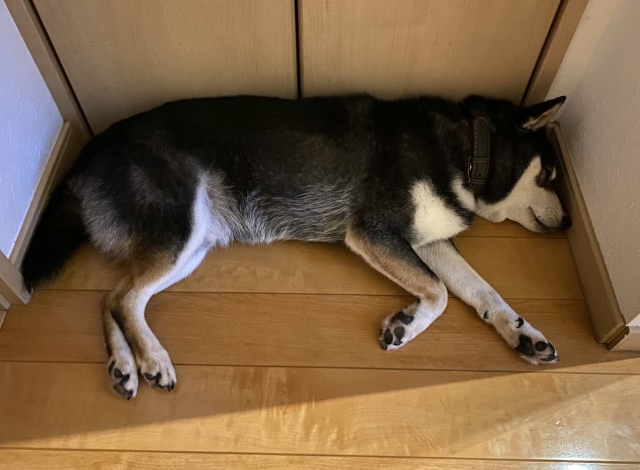 姿が見えないと思ったら、死角となる物置き前のスペースで横になっていました。