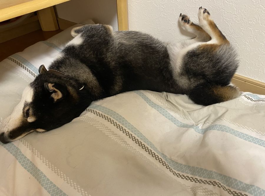 寝室に起こしにいってみると、ゴンちゃん専用マットの上でなんともいえない体勢で寝ていました。