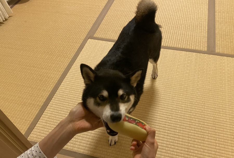 和室でホットドッグのおもちゃを投げてもらい取ってくるだけですが、それがゴンちゃんは大好きなようです。