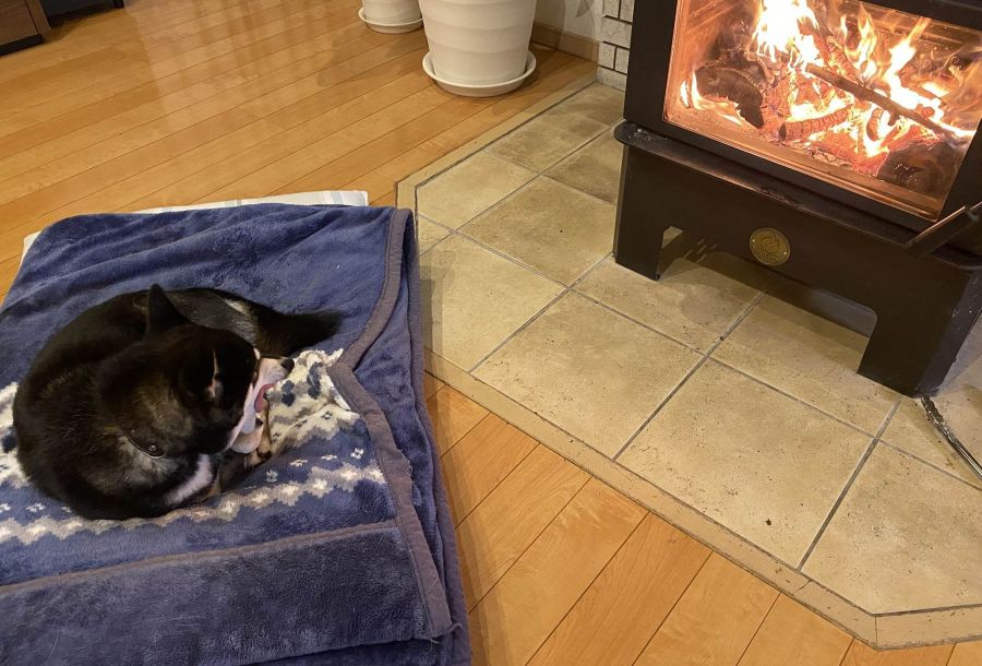 室内も暖かいので薪ストーブの火も抑えてあるのですが、ゴンちゃんは少し物足りない様子?