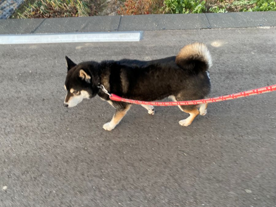 夕方のお散歩中のゴンちゃん。近所の川の堤防沿いを歩いています。