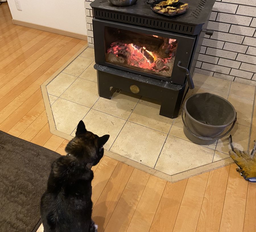 早起きのゴンちゃんは、薪ストーブの前でちょこんとお座り。