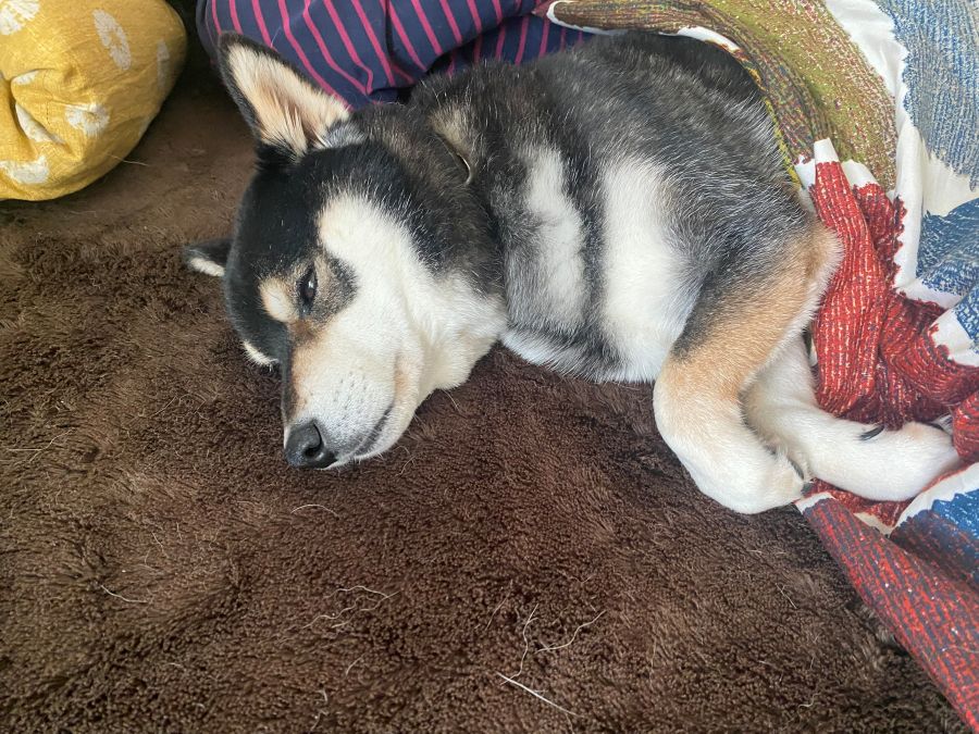 ちょうどお昼寝の時間帯、ゴンちゃんは家族と一緒になって布団の中でお昼寝タイム。