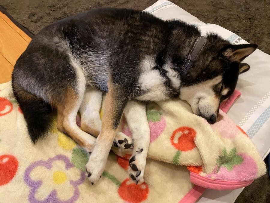 ゴンちゃんが起きると、寝室に敷いてあったマットを薪ストーブ前の安全な位置にもってきて敷いてあげるのですが、その上でゴンちゃんは再び気持ちよく寝ています。