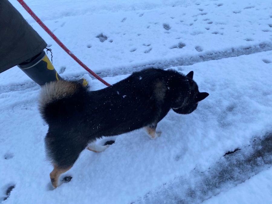 積雪は約5㎝ほどでしょうか。日中気温が上がればあっという間に溶けてしまうぐらいの雪ですが、ゴンちゃんは楽しそうにお散歩です。