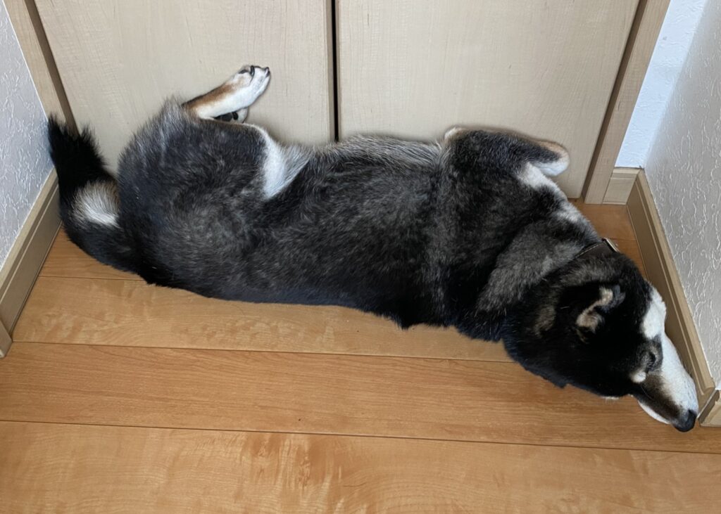 どこに行ったのか探すと、リビングルームの死角になっているクローゼット前でゴロンと横になっていました。