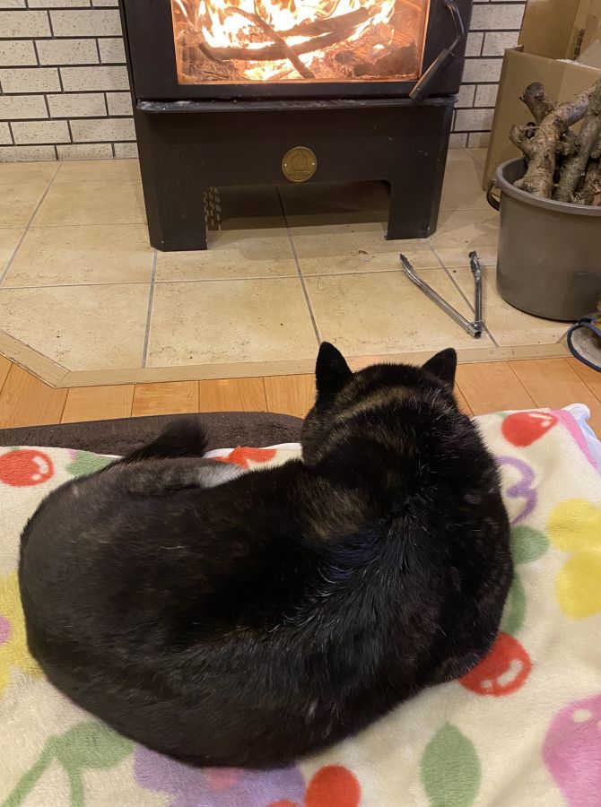 ゴンちゃんもポカポカと暖かい薪ストーブの前が気に入っています。