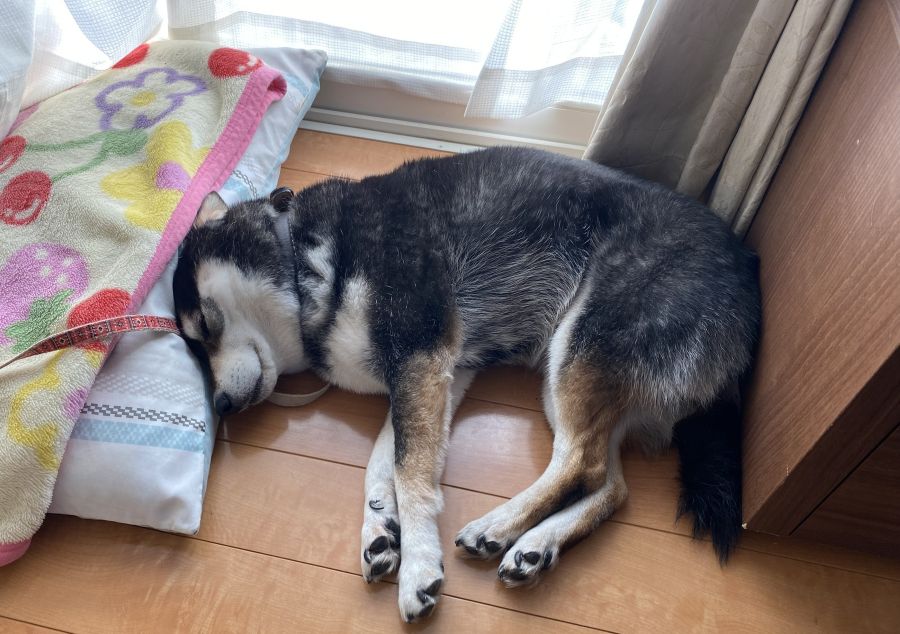 なぜかマットの上ではなく、その下で休むゴンちゃんですが、ちょうどこの場所が落ち着くのでしょうか?