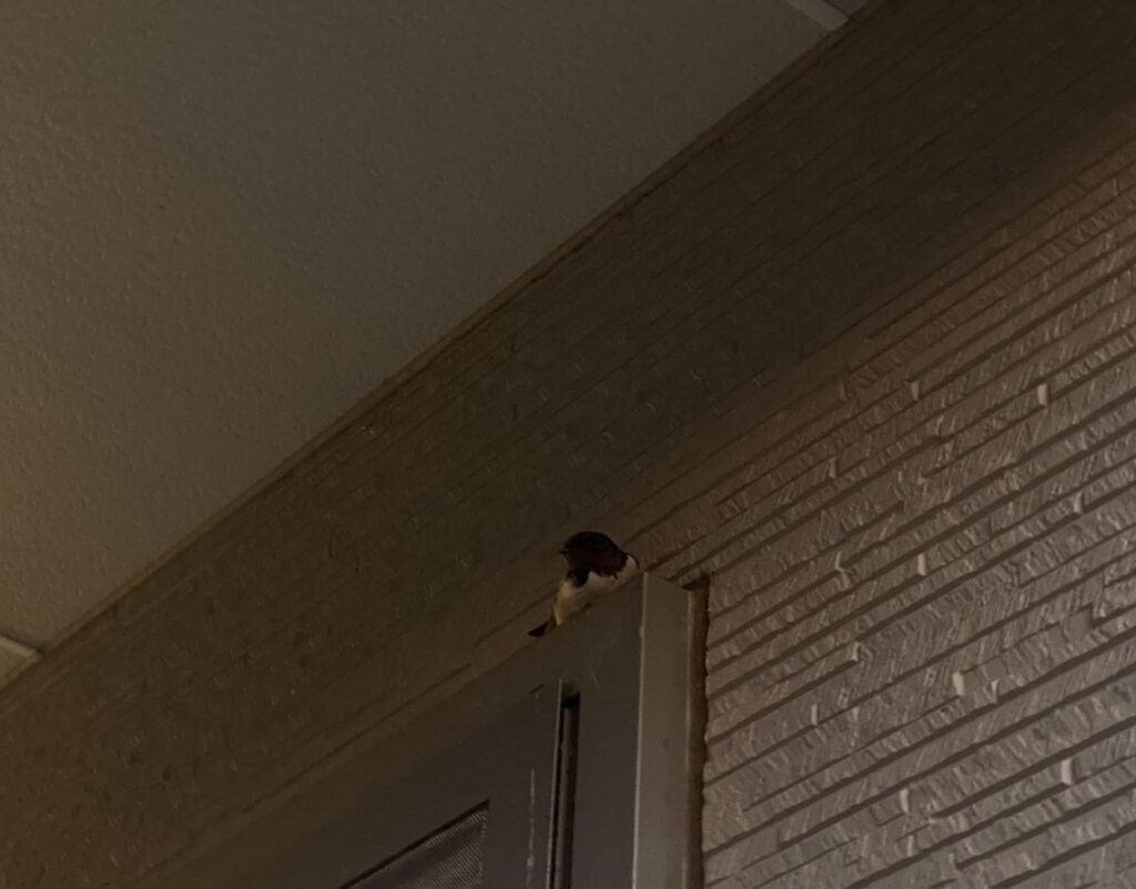 軒下のサッシ枠の上を見ると、1羽のツバメが休んでいました。
