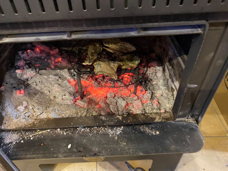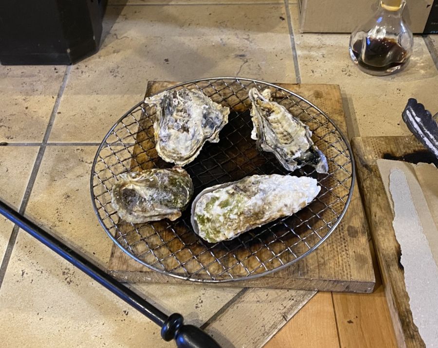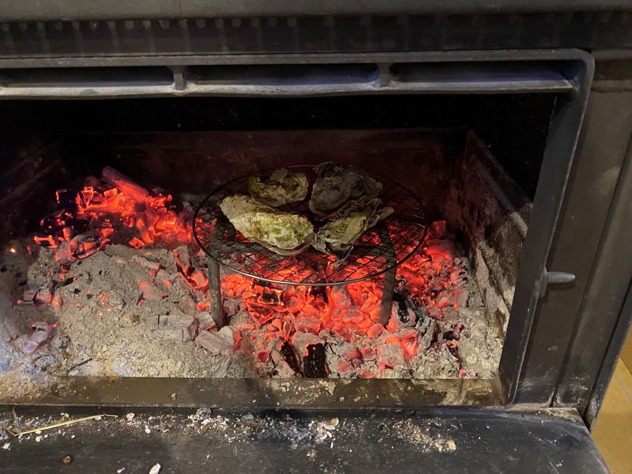 薪ストーブのドアを開けると、焼き牡蠣の香りが漂ってきます。