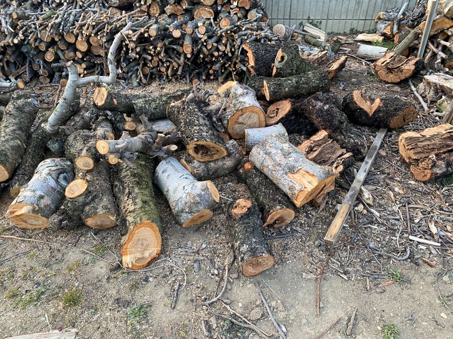 薪を切ったりする作業は庭先で行っていますが、まだまだ切ったままの果樹がゴロゴロ。